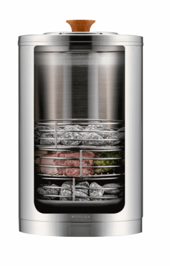 내부는 위 사진처럼 층층이 이뤄져 있다. 총 6단이 들어간다. 층 중간중간 달궈진 맥반석을 넣어서 그 열로 음식을 익힌다. 불에 직접 굽는게 아니기 때문에 그을음이 발생하거나 음식을 태울일도 없다. 가족들과 같이 불명을 즐기면서 맥반석돌을 달구고, 먹고싶은 음식을 같이 담고 바베큐그릴 본체에 넣기만 하면 된다. 넣고 15분만 기다리면 된다. 맥반석에서 나오는 열기가 본체의 단열성으로 내부에서 돌면서 음식을 익혀준다. 혼자 외롭게 고기를 굽던 시간에서 벗어나 가족과 함께 얘기하고 친구와 술을 마시며 시간만 보내면 된다. 그리고 음식을 즐길동안 또 맥반석을 달구고, 더 먹고싶은 음식을 구으면 자리를 비우지 않고 캠핑을 즐길 수 있다.