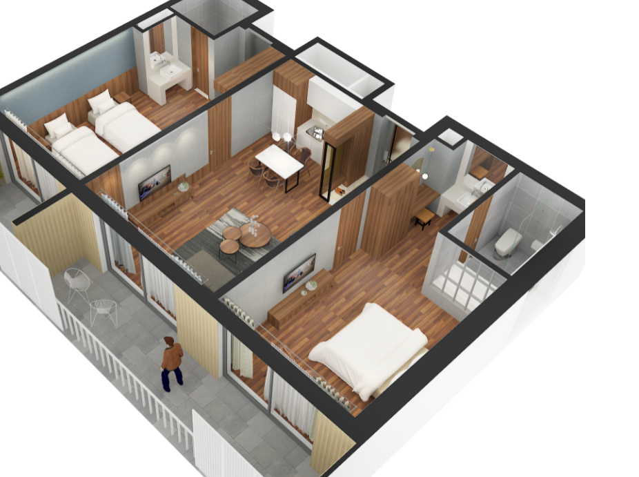51평방의 구조는 아래와 같다. 방2, 거실1로 구성되어있고, 취사가 가능하다. 2가족이 함께 할 경우 적당한 크기다. 방마다 화장실이 있기 때문에 가족단위로 방문시 불편함 없이 화장실과 침실을 이용 할 수 있다.