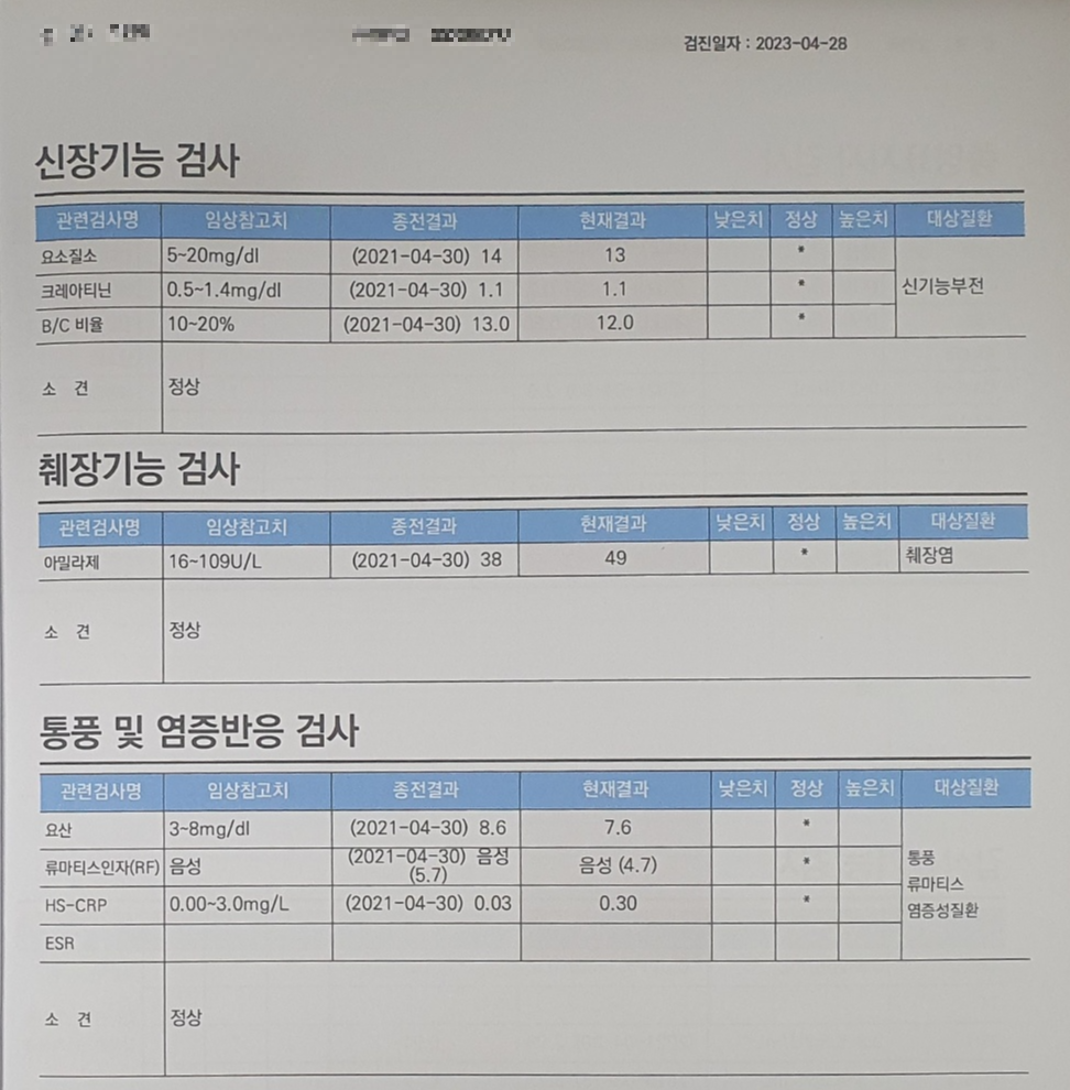 - 신장/췌장기능 정상 및 통풍 및 염증반응검사 정상