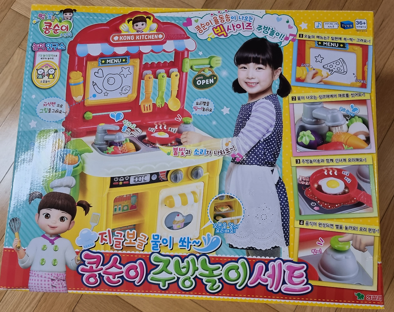 - 구성품: 주방 본체, 탈부착 가능한 바구니, 요리도구(10종), 야채(4종), 음식 모형(3종), 자석칠판, 다양한 소품 등으로 알차게 구성되어 있습니다23.