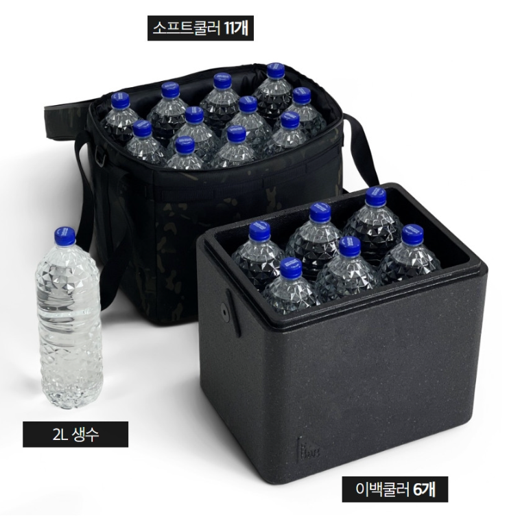 이백 쿨러는 심플함과 가벼움이 가장 큰 장점이다. 스티로폼으로 된 외관으로 약해보이지만, 110kg의 하중을 버티는 튼튼한 쿨러다. 캠핑짐을 실을 때 아래에 넣어도 충분히 버틸수 있는 힘을 가지고 있다. 용량은 20리터이다. 2리터 생수병 6개를 세워서 넣을 수 있을정도의 용량이다. 생수병을 세워서 넣을수 있는 하드 케이슨 많지 않다.