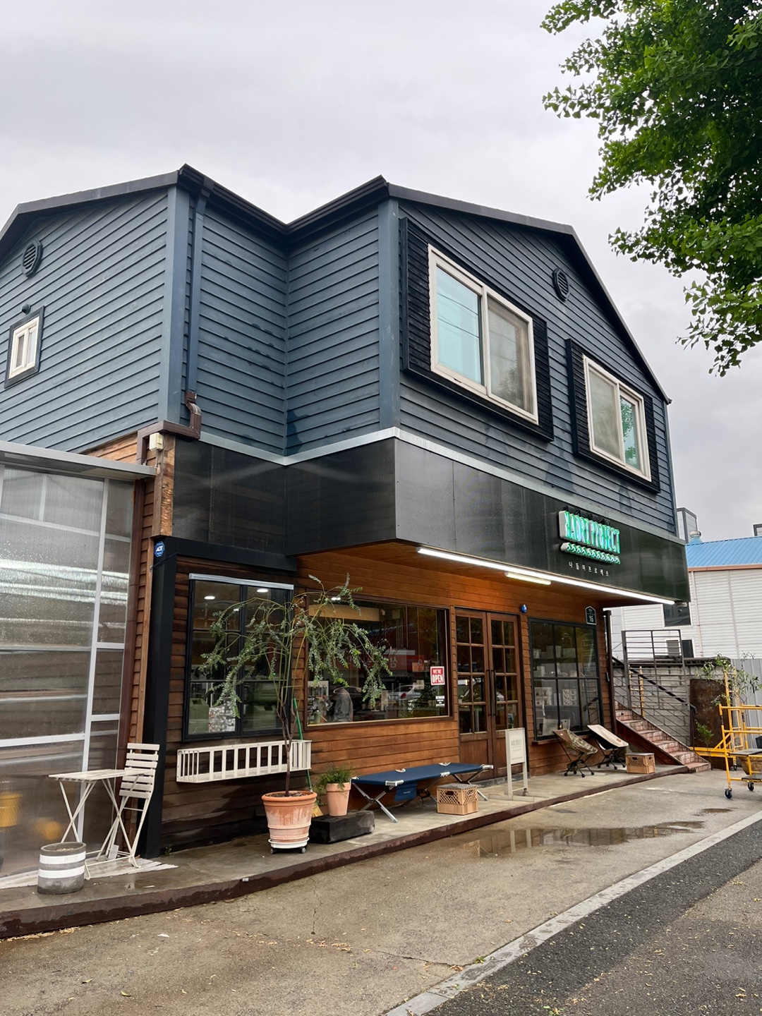 외관부터 감성있는 2층집이다. 밖에도 캠핑용품을 이용한 벤치와 우유박스 테이블이 있다. 이때까지도 밖에서 캠핑의자에 앉아서 커피를 마실 계획이었다.