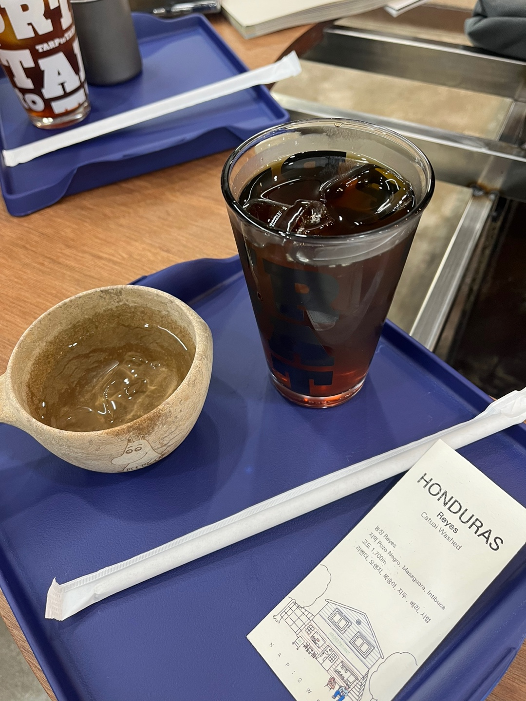 구경중 주문한 커피도 나왔다. 커피는 에스프레소와 드립커피를 모두 판매중이다. 에스프레소는 어느 커피매장에서나 마실수 있지만, 드립커피는 흔치 않기 때문에 드립커피로 주문했다. 에스프레소랑은 다른 맛이지만, 여기방문한다면 꼭 드립커피를 마시길 추천한다. 주문하면 즉석으로 커피를 갈아서 커피를 내려준다. 다음에 방문해도 또 드립으로 마실거다. 물은 쿠피카 컵에 주셨다. 쿠필카도 구매하기전에 써보기 어려운 제품인데, 물잔으로 주신다. 물을 오래 담을수록 색이 변하는 쿠필카 컵도 판매중이다.