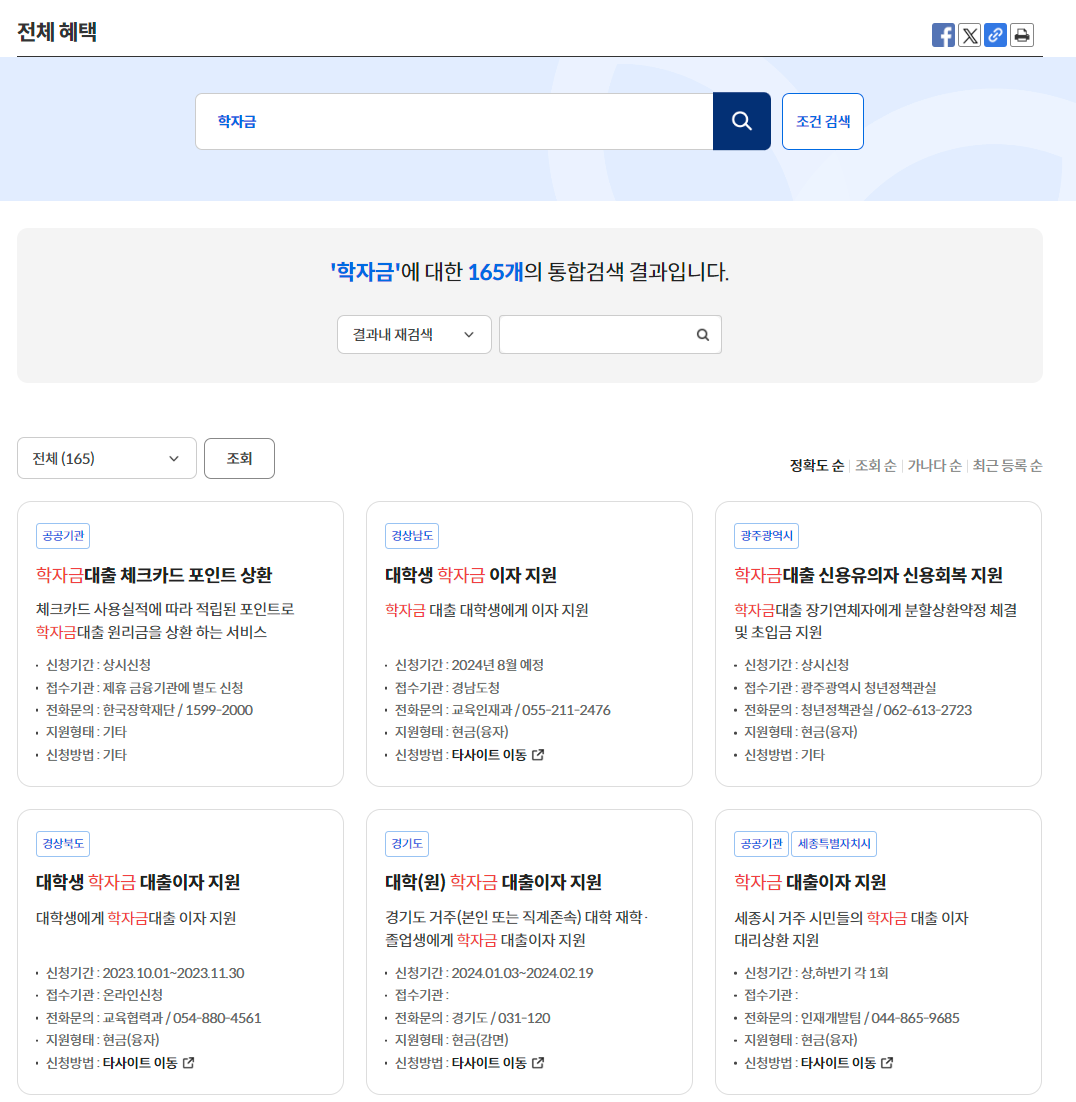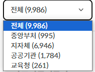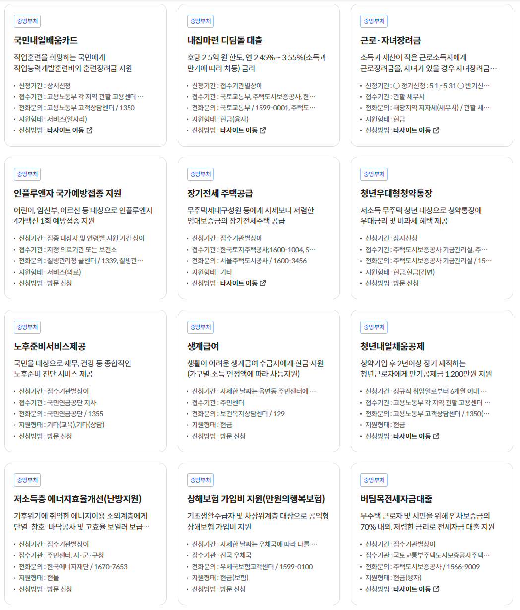 중앙부처에서 지원하는 혜택 외에 지자체, 공공기관, 교육청에서 지원하는 항목들을 모두 확인할 수 있도록 되어있네요. 현재는 총 9,986개의 지원사항이 있습니다.