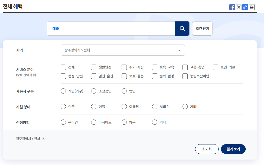 혹시나 정확하게 지원받고 싶은 항목이 정해져있다면 검색창 돋보기 옆에 '조건 보기'를 클릭해주세요. 조건보기를 활성화 시키면 아래와 같이 지역도 선택할 수 있고, 방법, 지원형태도 확인 할 수 있습니다.