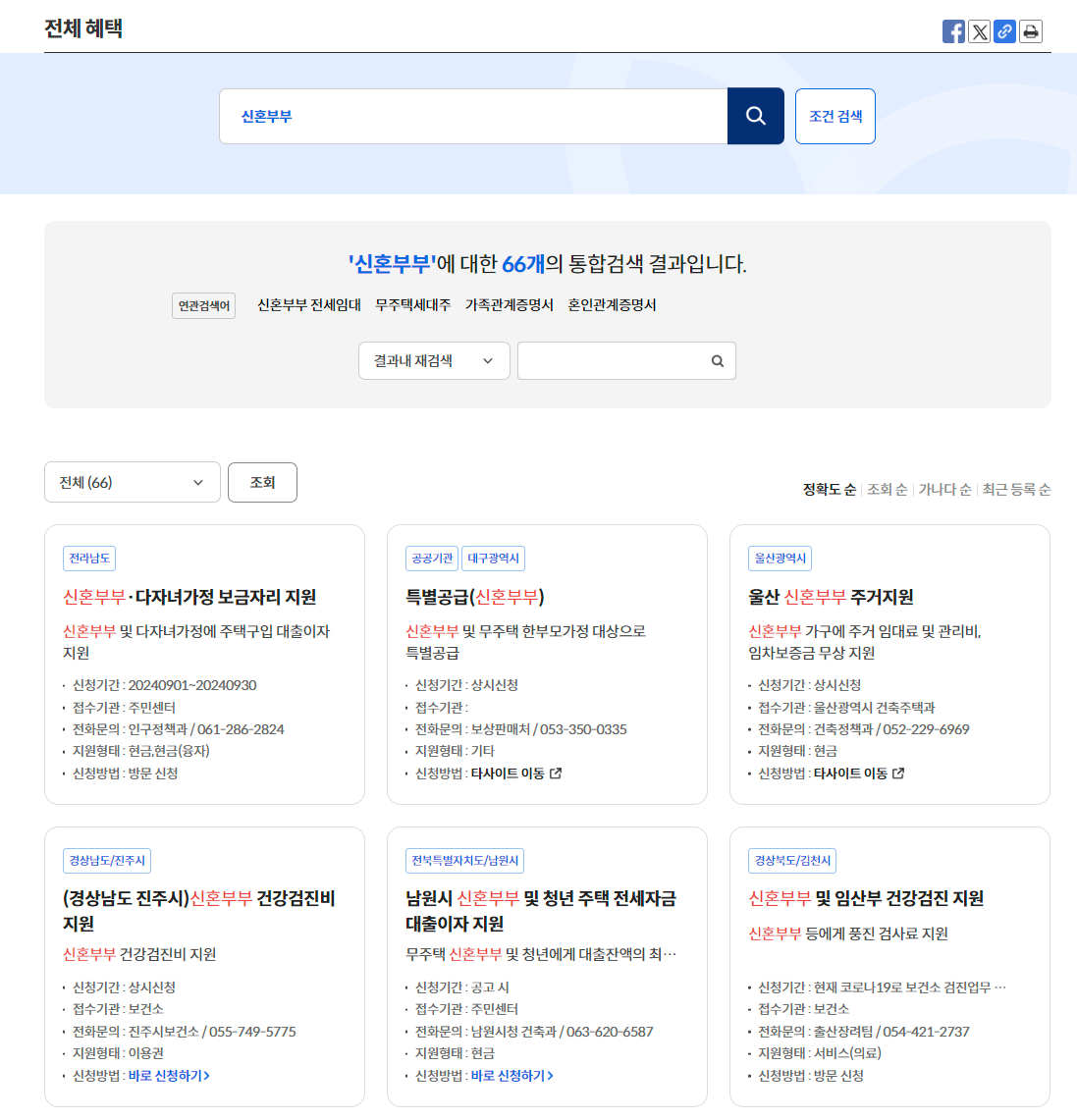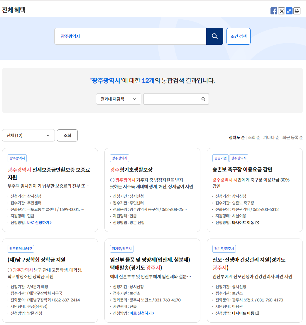 또한 지역명을 입력하면 지역별 지원하는 항목에 대해 조회할 수 있습니다.