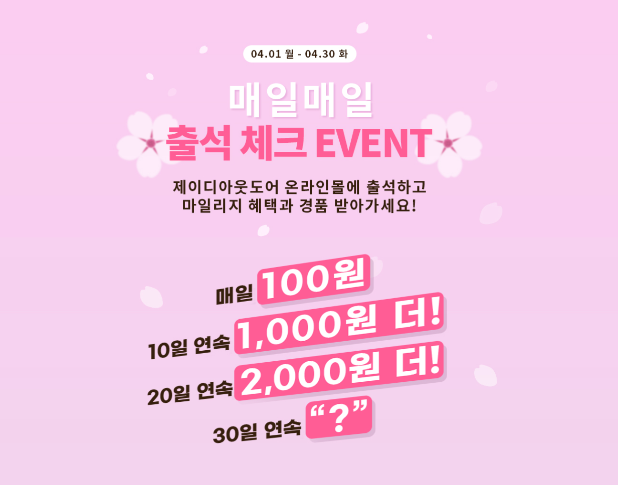 바로 '매일매일 출석체크 이벤트'입니다. 이제부터 4월 1일부터 30일까지 매일 '제이디 아웃도어'의 온라인몰을 방문하여 출석체크를 하면 매일 💰100원의 마일리지를 쌓을 수 있습니다.