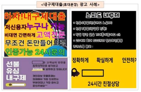 내구제 대출 = 나 스스로를 구제 한다 라는 뜻으로, 급전이 필요하지만 금융기관을 통해 대출을 받기 어려운 경우 찾는 불법적인 대출종류이다. 대출이 어려운 사람들이 휴대폰 개통을 통해 돈을 빌리는 불법 사금융이다. 자신의 명의를 넘겨 휴대폰을 개통시켜주고 대가로 급전을 받는다.