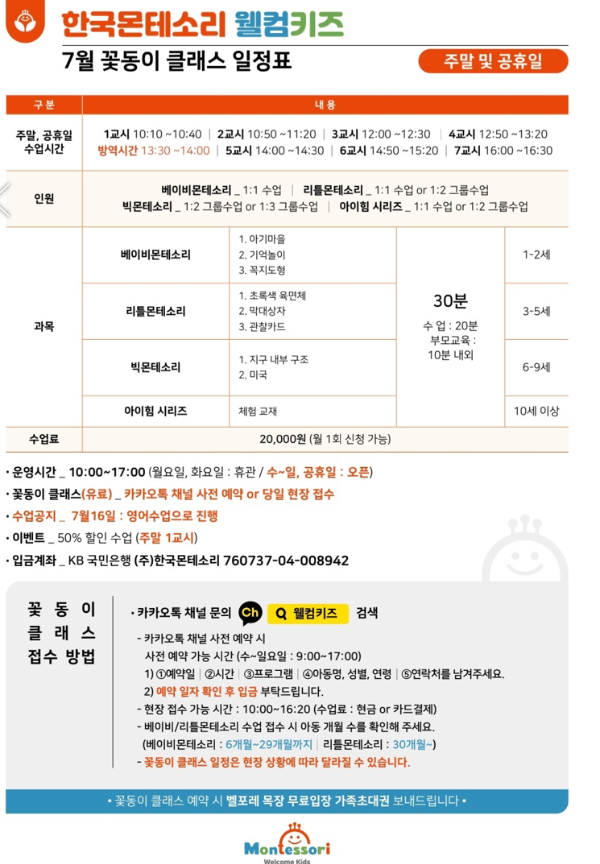 클래스는 사전에 예약하고 방문해야 이용할 수 있다. 클래스 시간과 체험료는 아래 사진을 참고하면 되겠다. 이번에 체험한 클래스는 리틀몬테소리 클래스다. 처음에는 20분에 2만원이 비싸다고 느꼈는데, 체험후에는 아깝지 않다고 느꼈다. 항상 아이가 잘 크고 있는지 궁금했는데, 클래스를 해보면서 선생님이 아이와 놀아주는 모습도 볼수 있고, 클래스 후에는 아이의 발달에 대해 상담도 받았다. 내가 문제라고 생각했던 점은 당연히 아이들에게 나올 수 있는 행동이었다. 배운점은 아이들에게 집중력을 강요하지 말아야 한다는것을 느꼈다. 3살아이는 원래 그런거다. 점점 집중시간이 늘어날것이다.