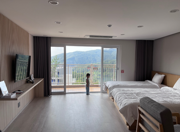 방도 넓고 깨끗하고 좋았다. 더블베드 1개와 싱글베드 1개가 있다. 베란다에서 산과 호수가 보인다. 전객실이 호수뷰로 되어있어서 방에서도 탁트인 풍경을 볼 수 있다. 방에는 커피포트와 미니 냉장고, TV가 있다. 건물에 전자레인지는 없으니 참고하길 바란다.