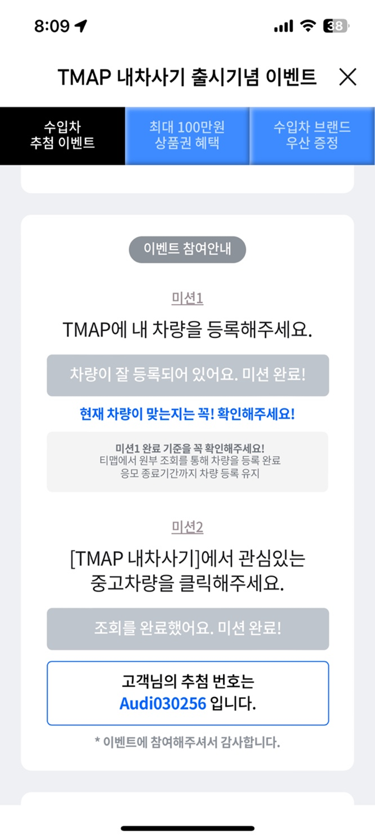 미션 1과 2를 모두 완료하면, 최종응모하기 버튼이 활성화되어 이벤트에 참여할 수 있습니다. 간단한 미션을 수행하고, 럭셔리 자동차 경품의 주인공이 될 기회를 놓치지 마세요!