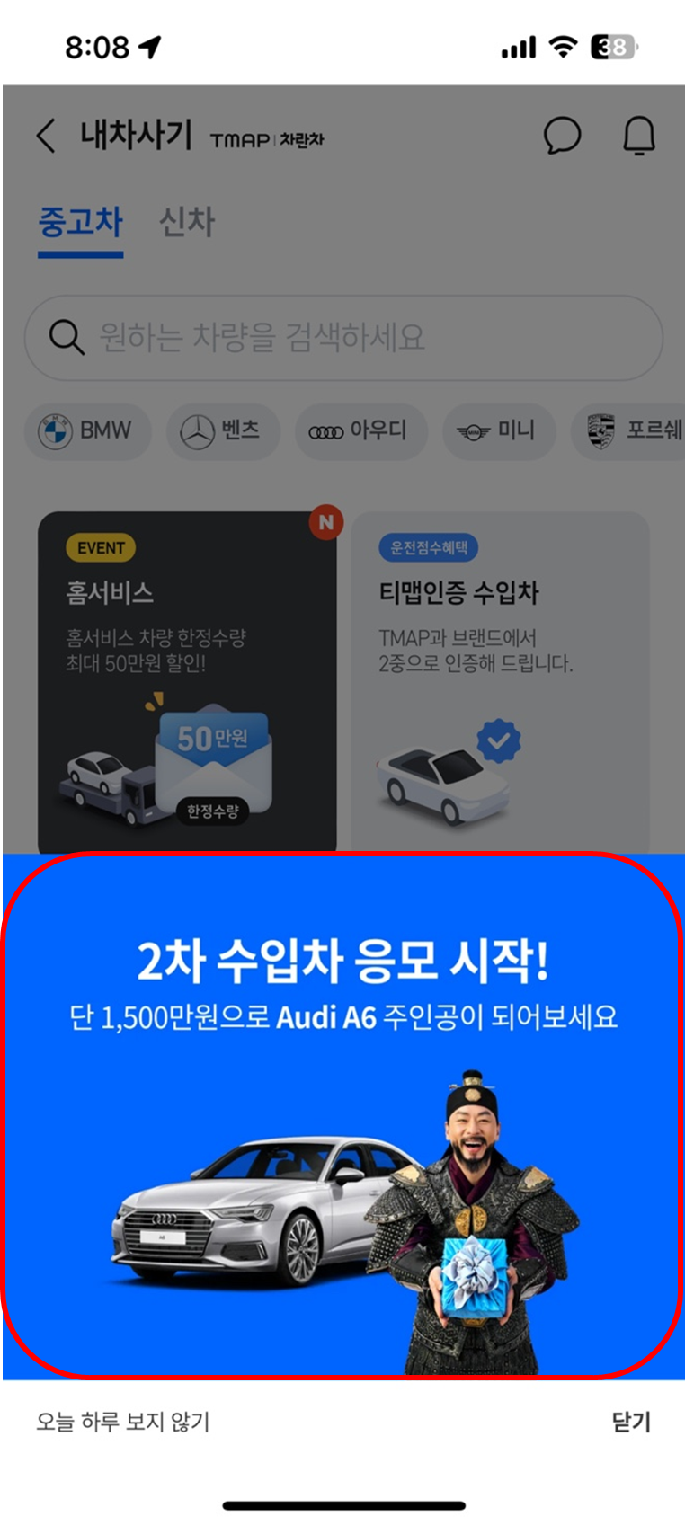 1. TMAP에 어플을 실행한 후 하단의 "내차사기" 클릭, 현재는 '아우디증정' 이라는 이벤트 상품이 팝업되어 있습니다. 핸드폰으로만 참여가능하니 핸드폰으로 진행해주세요.