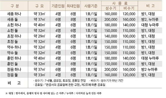 - 이용료 : 4인 1박 12~16만원, 6인 16~20만원 *성수기/비수기 가격차이 있음