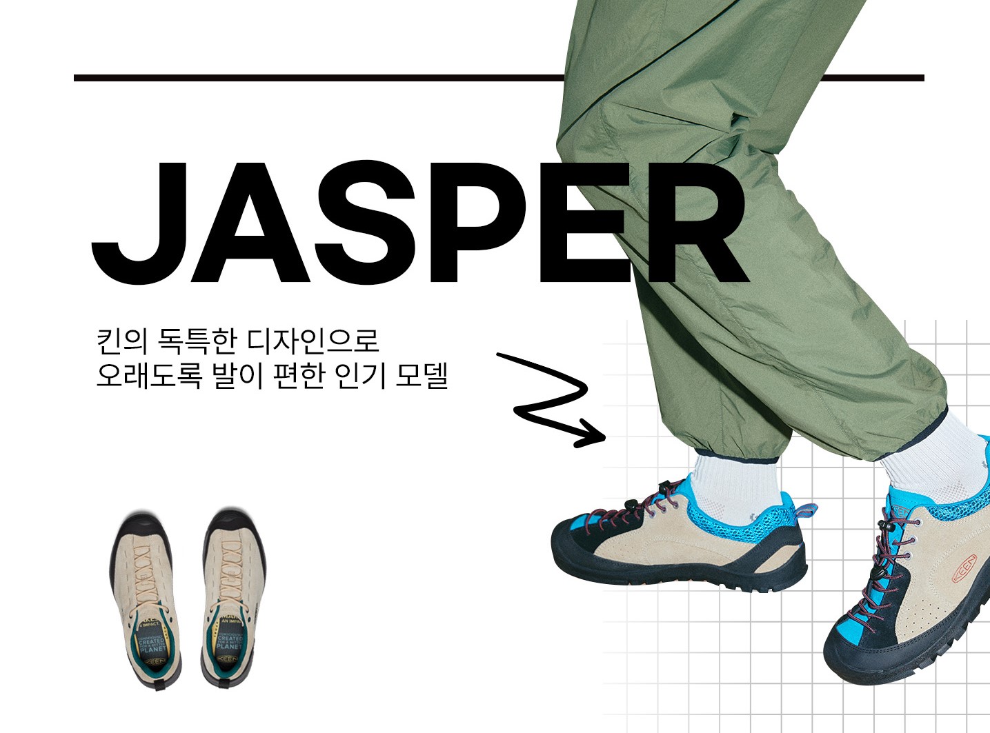 재스퍼 중에서도 위 사진에 있는 디자인은 재스퍼 ROCKS SP이다. 이 신발은 가을, 겨울을 타켓으로 출시되었다. 기본적으로 스웨이드가 베이스인 신발이다. 그렇기 때문에 여름에 신기엔 저울수 있다. 그런 고민을 해결하기 위해 발목부분가 발등은 메쉬 재질로 만들었다. 여성용은 베이지&블루(메쉬), 남성용은 블랙&오랜지(메쉬)로 출시되었다. 나는 개인적으로 베이지&블루가 더 이쁜것 같다. 블랙은 너무 더워보인다. 가격대는 10만원 중반대