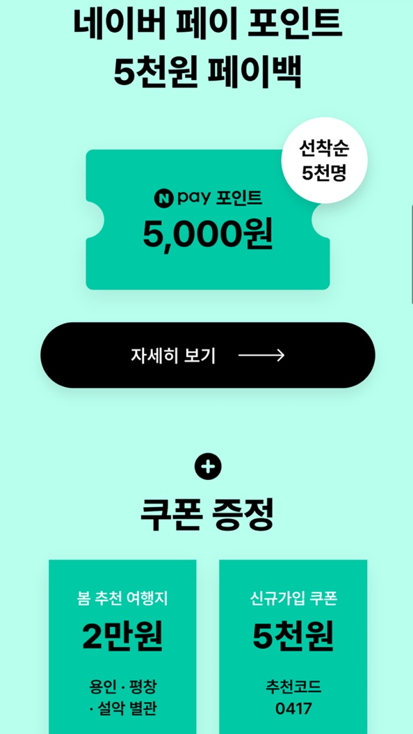 - 네이버페이 포인트 예약 시 선착순 5천명에게 5천원 페이백 혜택 제공