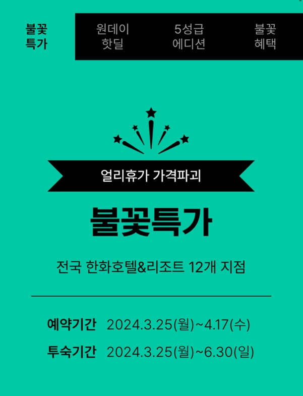 한화리조트에서 펼쳐지는 불꽃세일 이벤트가 찾아왔습니다. 기간은 3월 25일부터 4월 17일까지이며, 이 기간 동안 다양한 특가와 혜택이 준비되어 있습니다.